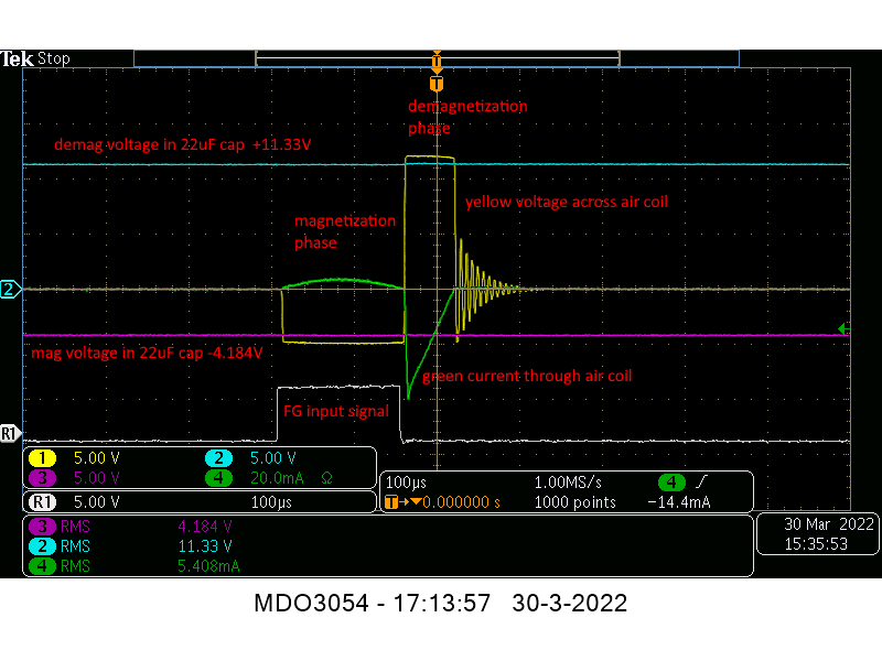 The measurement uses a 10K load resistor with a 22uF capacitor parallel on both the magnetization as the demagnetization phase, see top part diagram: