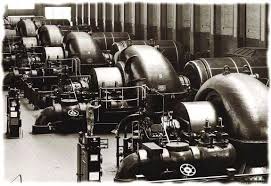 The curious design of the Herzmaschine prompted me to dig a little further into its background. It seemed slightly odd that the Metropolis power station wasn’t simply based on the appearance of a typical turbine & generator hall of the era. After all, these would have probably looked reasonably “modern” to 1920s audiences. Here is a typical example, which was build in 1922:  The set designer for the movie was an artist named Erich Kettelhut. It is now possible to see many of his original sketches for the Metropolis sets and models online. Interestingly, his original sketch for the ‘heart machine’ looked nothing like the final set:  Maybe director Fritz Lang wasn’t keen on this design, and asked to see something that looked a bit more “futuristic” instead.