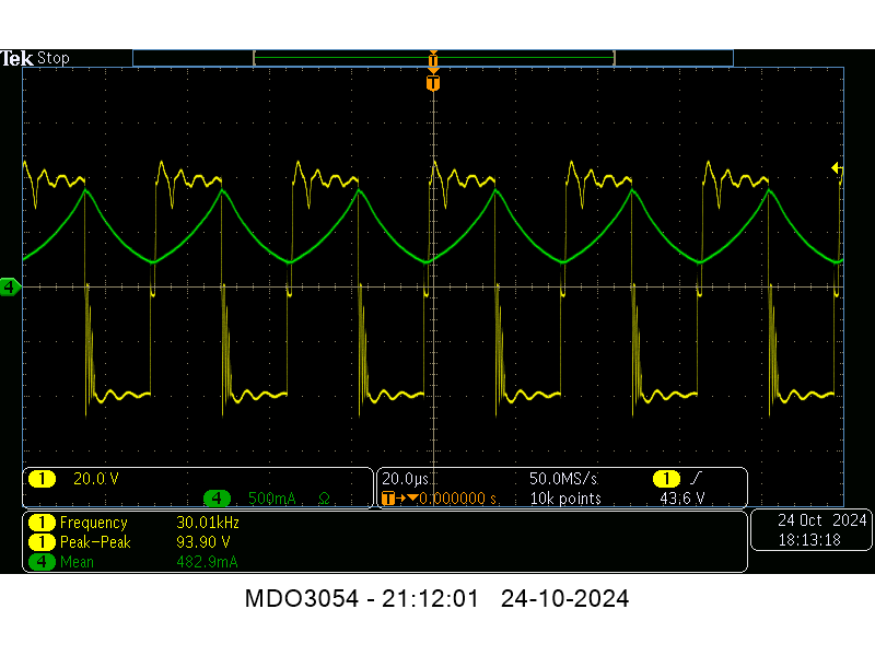 This is a follow up of my posts #505 and #507 using 'Lytics however, this test was run with 2 stacked toroids to increase the primary inductance and reduce some saturation.