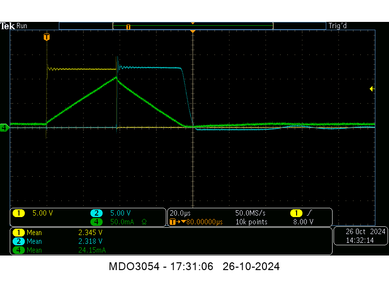 Pulse frequency is 13kHz at 100ms repetition rate, and we now see similar voltage traces like in your screenshot, only my current is shown at 50mA/div. (probably due to my CH4 being at 50 Ohm).