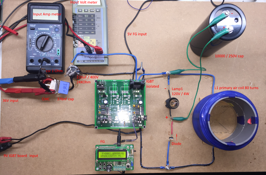 L2 secondary 2x 144 turns ferrite cores separated by 1.5mm gap: 4mH    (this L2 is not yet in use in the present basic circuit!!).