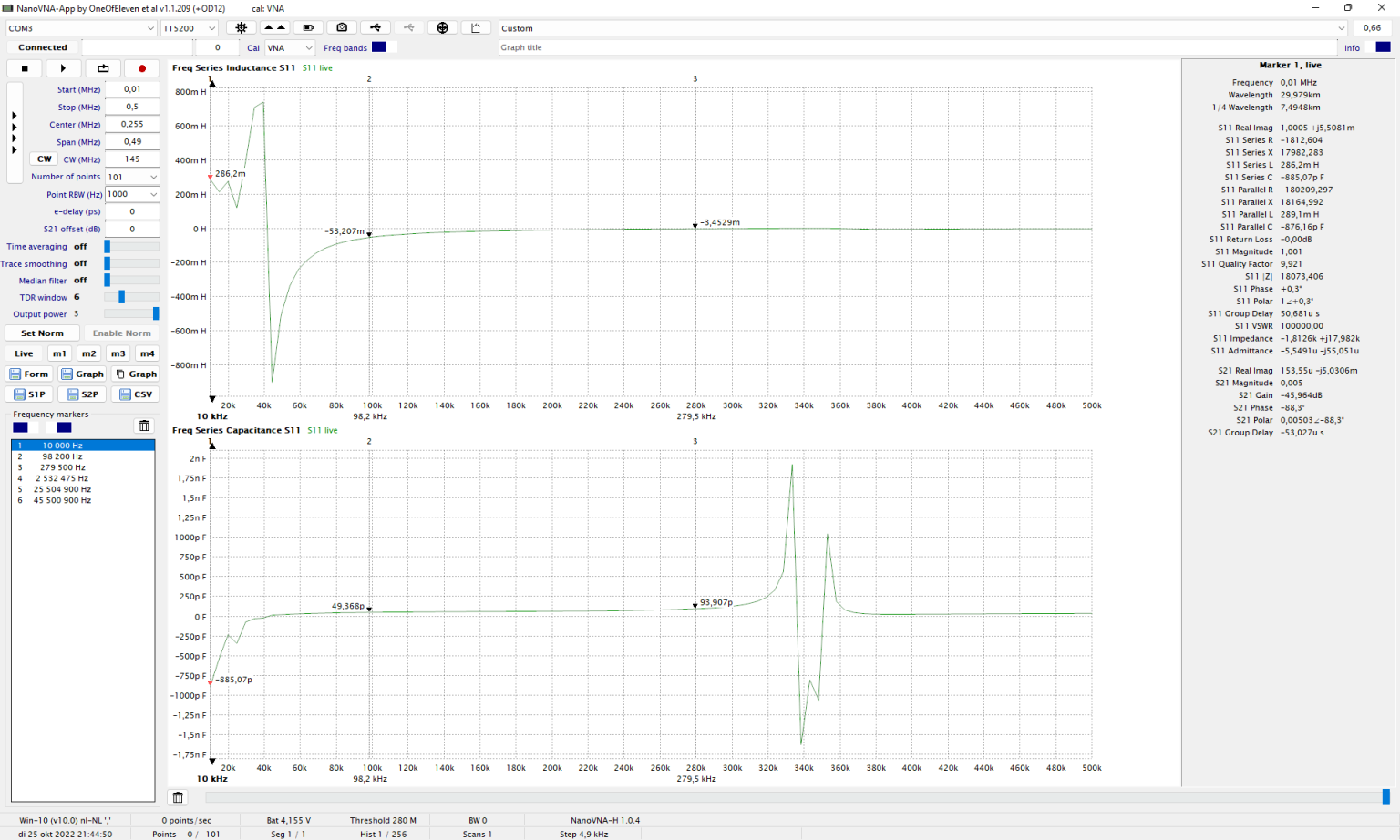 At 10kHz (see marker 1) it corresponds with the value measured by my LCR meter (280mH), but then it fluctuates rather strongly and ends up negative to 500kHz as shown.