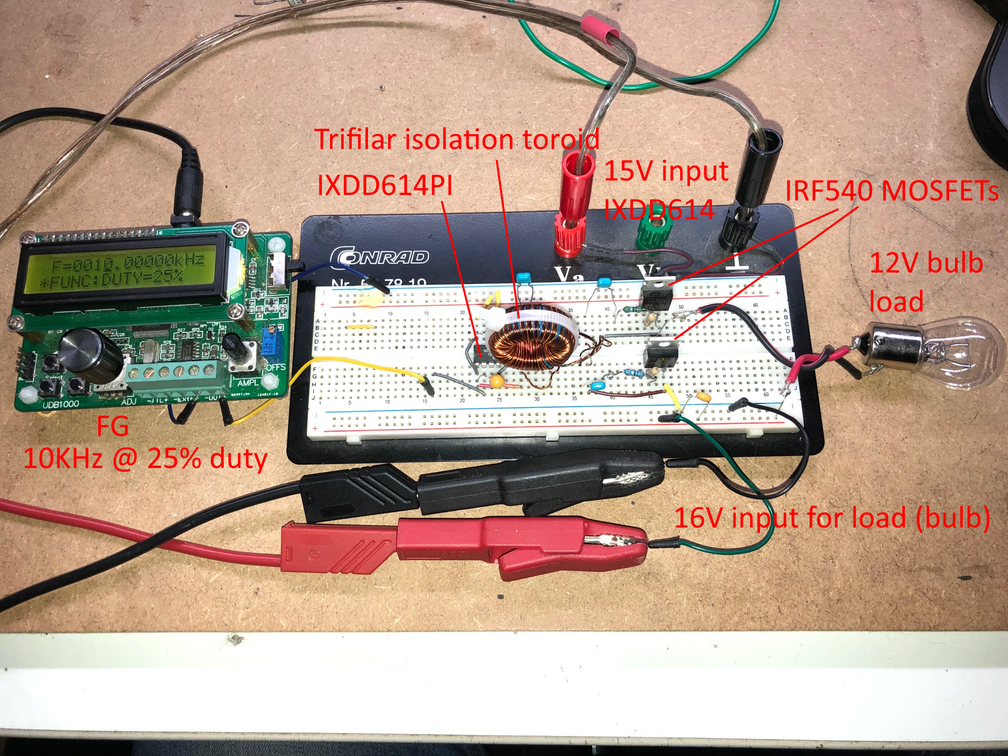 So i use some low voltage IRF540 MOSFETs for now and a 12V bulb as load, just to see if things work.