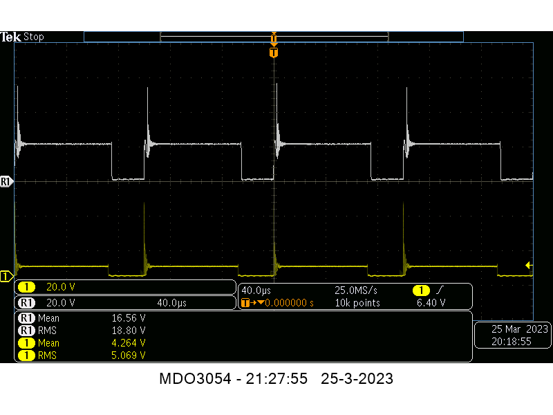 Both seems to show that the upper (white trace) MOSFET is doing more work looking at the mean and rms voltages (current through both MOSFETs should be the same)