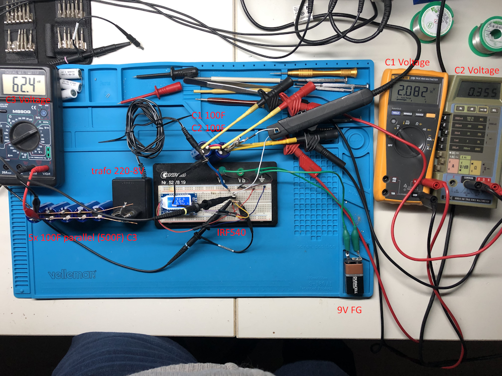 So i  monitor the voltages with DMM's across the 3 super caps C1, C2 and C3 which respectively are 100F, 100F and 500F which is less as Joel uses, but in the same relation.