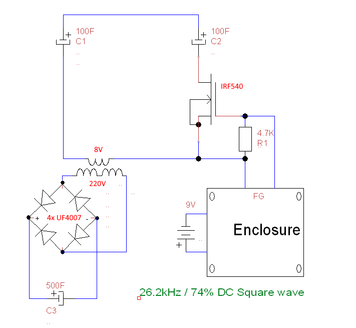 Yes 26.2khz. I agree. Re the caps - remember the odd behaviour due to pulsing. Maybe a switched-mode trafo would handle the frequencies.