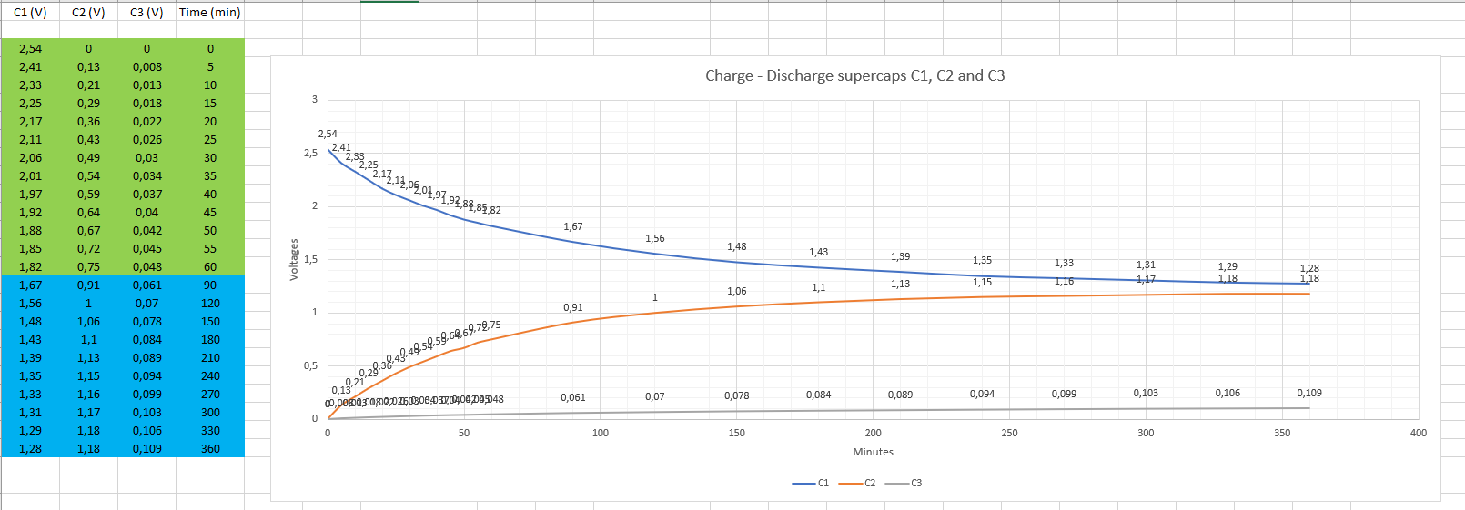 I did a first test making sure to drain (short) both C2 and C3 so they were 0V and charged C1 to 2.7V then noting down initially every 5 minutes the voltage over C1, C2 and C3.