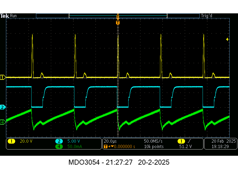 These scope signals can be seen here where yellow i the drain - source voltage, blue is the gate - source voltage and green the drain - source current.
